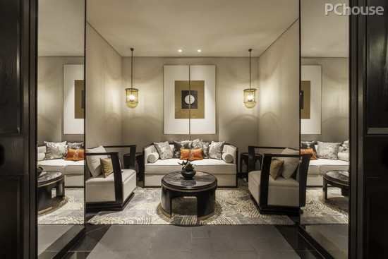 利用玻璃隔板分割空间,打造“初极狭”的空间感受,再走数十步,进入宽阔明朗的休闲区,产生“豁然开朗”的感受,增加空间的趣味性。以水墨色作为设计的色彩走向,辅之以明亮的色调,整个空间透着古朴而自然的方向,又不会过于乏味。本案空间以古玩、瓷器、盆景、挂画等软装饰品作为陈设,塑造出传统与现代融合的人文意境。