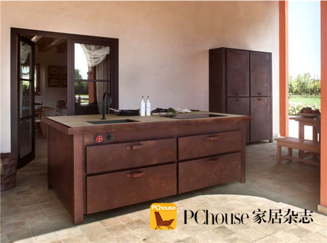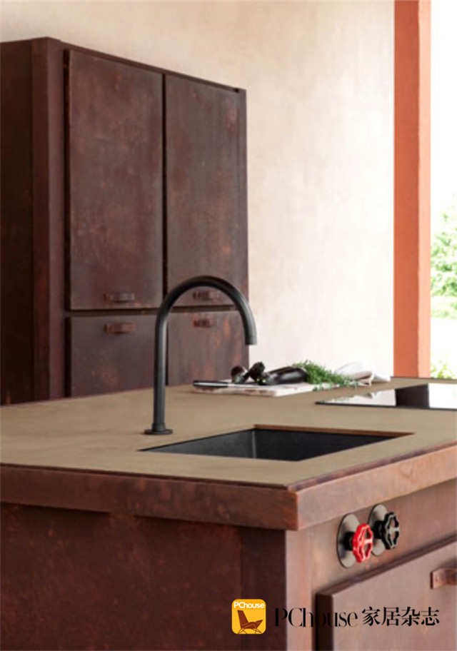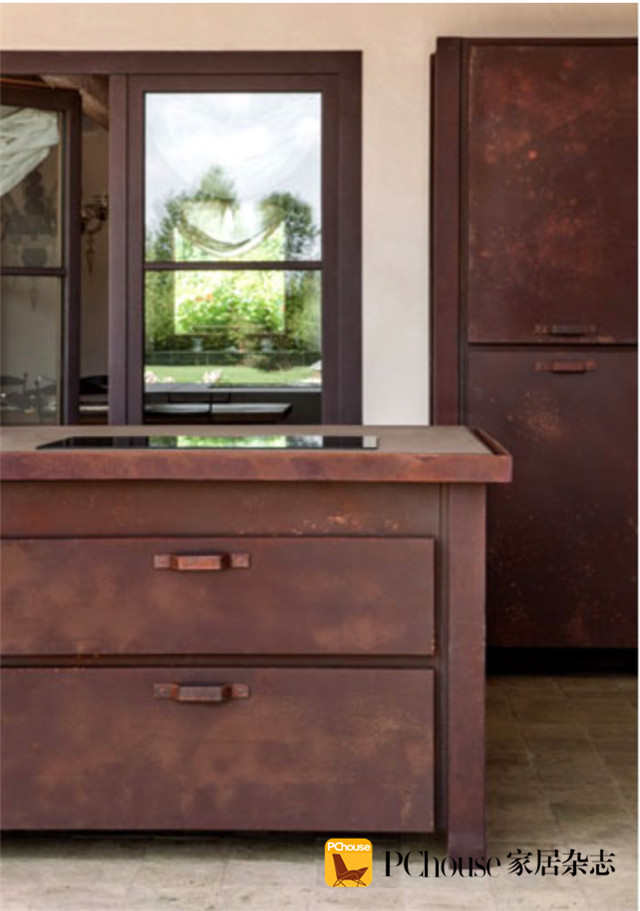 本季的厨房设计还引进了一些小说里面对厨房的描述情节,比如运用了大胆的铁锈材质,这是意大利传统的复古外观,这种不同寻常的材料,提供了高度红褐色的复古质感,但如今将它呈现出来,还给予了当代的感觉。这里工业感的旋钮和细节也增加了复古魅力。