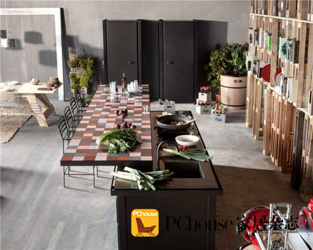 另一个让人联想起意大利工匠传统的新奇之处是这个精心布置的工作台,结合传统,复古和尖端的技术,组成了一个多功能岛台。这是一件镀有鹅卵石的钢制工作台,并配以熔岩瓦片。它将西西里火山石制成的釉面花砖铺在一个金属框架上制成,拥有丰富的纹理和色彩,将天然的效果带回到厨房,创新与艺术感并存。