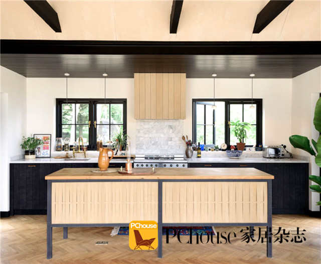 这里是一个独特和迷人的厨房设计,它拥有合适的明度,橱柜面板采用短榉木面板,面板天然呈现出粗糙的木纹图案,形成类似的厨房岛台具有哑光黑色的框架。
