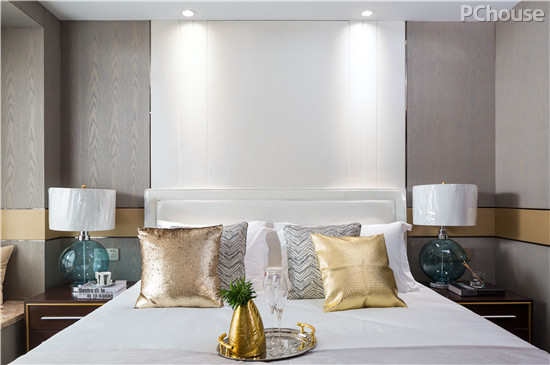 奢华主卧套房,白色给人一种纯净优雅的感觉,白色皮质背景墙犹如点睛之笔,使整个空间多了几分意境。贵妃椅散发暖白的光泽感,墙体木饰面板加金属线条造型凸显出墙体的立体感,刻画简约利落的点线面设计。步入式衣帽间、卫浴间阔绰的空间尺寸,合理的设计典雅高贵气质尽显。
