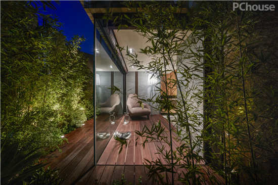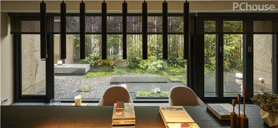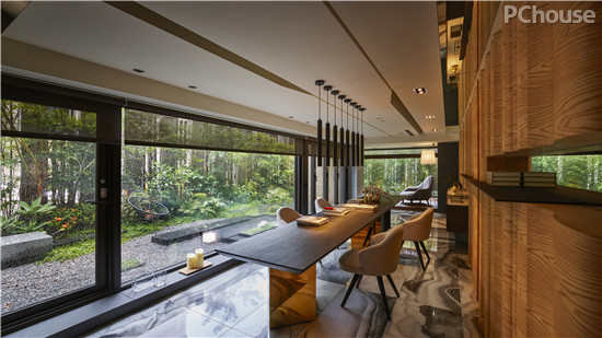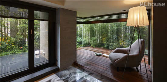 移步异景,随着阳光洒落的光影,来到由无框式大面玻璃呈现的竹林端景,透过三个空间层层交叠,层次间衬托出竹林的种种风情,从远观到身临其境都有不同的感受,在此空间阅读,更彷彿置身于竹林一般悠然、惬意。
