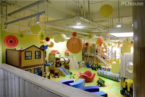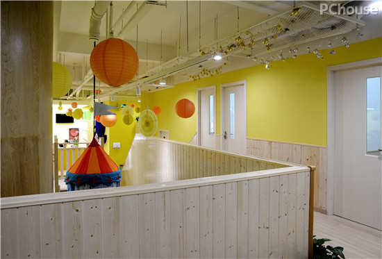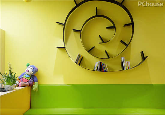 思考,设计师就如何设计出一处最“滋润”孩子们的娱乐和学习的天地?往往在成人的世界里,简洁,大块面的色彩才最为舒服,而在孩子的世界里,五彩斑斓的色调,偏暖色的色调(尤其是黄色),零零碎碎的东西才能勾起他们的兴趣,慰藉他们美好的心灵。所以本案以“孩子的眼光”为设计中心,去探索他们眼里的世界,他们眼里的色彩……