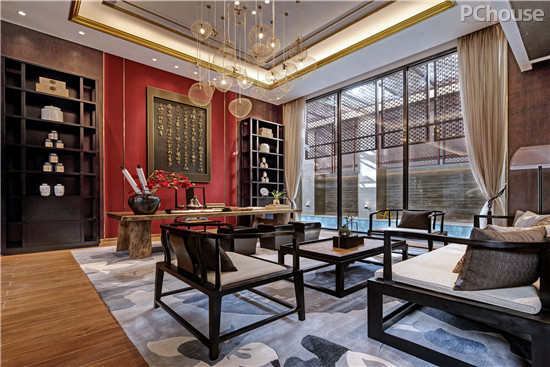 简洁典雅的玫瑰椅,端正清秀的坐榻,气质雍容的茶几边桌,质感上乘的柔软地毯,赋予空间古雅、质朴又不失现代的美感;其古朴的造型与正统的设色,成双陈设的器物装饰,流丽轩昂的水晶吊灯,共同造就空间的秩序感与对称性,俨然大气。