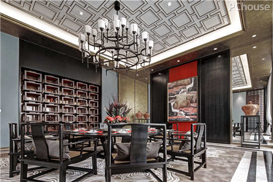 中餐厅的设计借鉴了中国传统建筑艺术,巧妙地融入现代简约型制。回形纹的古典框格装点天花,圆桌餐椅排列严谨有序,端庄的方与大气的圆,整体铺设出空间高雅秀逸的意境美。