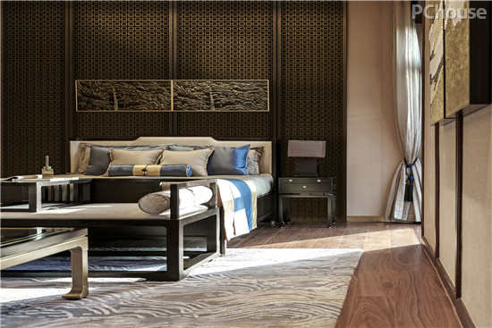 套房的设计雅静大方,高至天花的方格木屏风构架朴实,木版雕刻的山水画作大气凛然,整个空间在素雅的色调中透着风雅尊贵的气息。