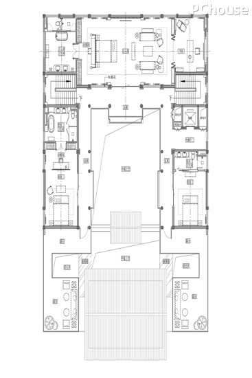挑高的屋宇、两侧全明落地门窗的设计,引入大量自然光线与气韵。整齐光洁的屋梁,精致大气的柜体,旧时中式床榻椅具,针脚细腻的丝质床品,再现了旧时合院生活的典雅,使居住者于此,心中疏朗又宏大。