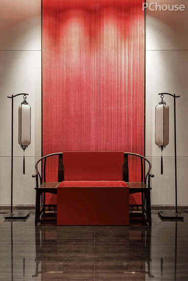 过厅,一抹明妍的鲜红映入眼眸。绒线穿落其间的壁挂前,一张宋时简椅,两盏明式纸灯,朱红与缟白互映,在细语交流中,空间更增添几分东方古韵。