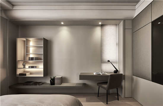 阅读区延伸客厅的几何元素,以纯粹清爽的墙面,赋予开阔舒畅的视觉感受。并着墨于于细节的勾勒,让工作桌及柜体线条呈现鲜明对比,使整体视觉上增添活泼意趣。空间中以大地色为主调,呈现静谧质朴的调性,营造沈淀专注的气氛。在阳光的自然暖意浸沐下,进行办公或阅读,恣意地悠游在无所拘束的想象空间里。