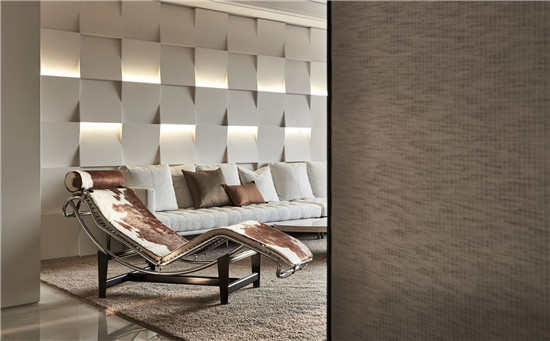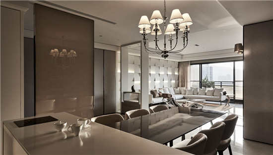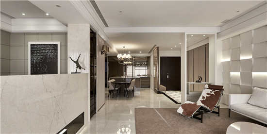 步入玄关后,随即被大片落地窗引入室内;伴随和煦的阳光洒落,带来敞朗舒适的空间感受。卸除实体隔间框架,采以穿透式的柜体替代,赋予视觉延伸的效果。沙发背墙为客厅主视觉上重要的一环,设计师透过方形白色块体及光线的错落有致,建构出凹凸有致的韵律感。墙面采用环保涂料,搭配冷暖质地的防火布质,回归住宅机能需求。客厅空间作为凝聚家的情感与招待客人的场所,透过化繁为简的设计哲学,与典雅大器的用色选材,呈现居家生活品味与空间质感。