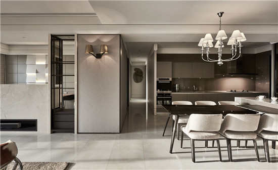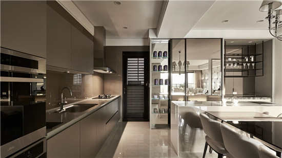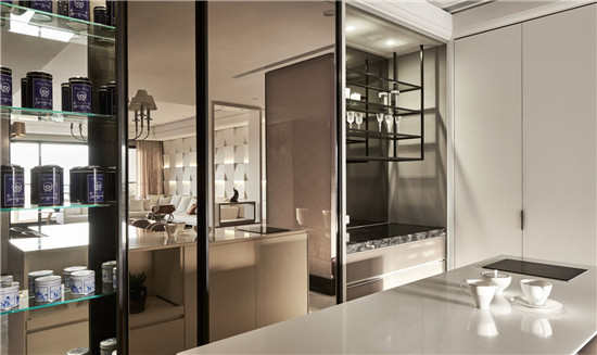 在动线规划上采开放式设计,使客厅的自然光线得以流泄至餐厨区,将餐桌、中岛及厨房三个区域连贯配置,围塑家的情感交流及餐叙氛围。L型的动线规划,让人自在地行走其中,享受悠闲的备料及用餐时光,亦达到空间的有效利用。并特别设计放置茶品及杯具的层架柜体,使宾客来访时主人能立刻沏水泡茶递给宾客品饮,共享品茗逸趣话家常。以贴近屋主需求及兼顾空间的格局规划,打造愉快美好的餐厨时光。