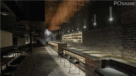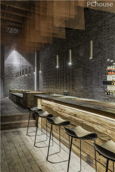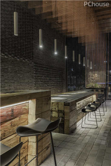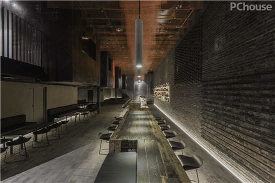 主要材料:墙面,手工青砖;地面,老木板;吊顶,镀铜金属网;长桌,老枕木;包间墙面,穿孔钢板;