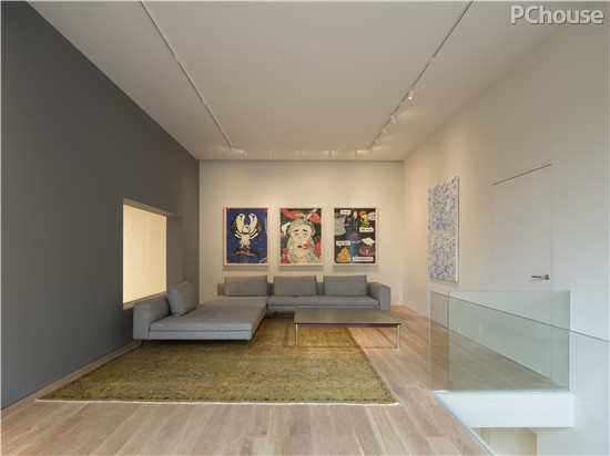 设计师将办公、VIP室、艺术家卧室及储藏这样的四个功能体块上下布置形成北侧的两个建筑体块。将两个展厅空间串联在一起布置在建筑南侧,使观展流线连续,在最南侧展厅的顶部开天窗,引入柔和的自然光。阳光漫射在墙面上,使挑高的展厅空间产生了神圣感。加装电动天窗帘对光线进行控制,满足了不同艺术品的展示要求。