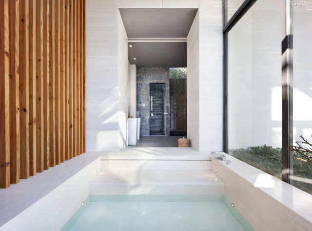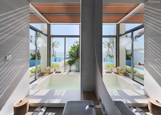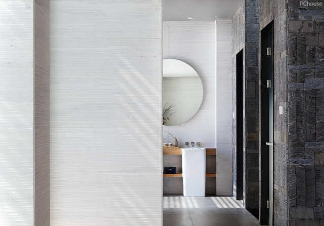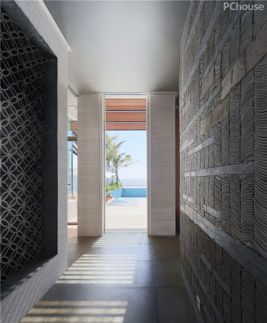 设计的主要空间在卧室,在设计上却不作浮华堆砌,只用干净洗练的线条建立一个清简恍如只隐约存在的空间关系,辅以原色为主的软装,任由朴素营造一个心灵可以完全放空的环境,又将使用者的目光由此自然投放到海天之间;在过道、泡池和洗手间这样的次要空间则利用材料营造质感,生发对岁月蹉跎,白驹过隙的感叹。莫辜负了这片刻的好时光。