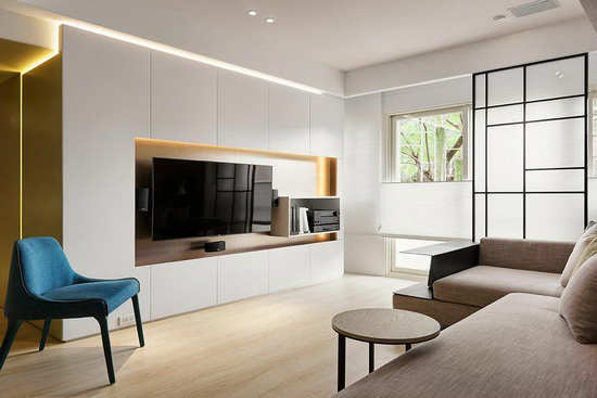 编辑点评:以简单利落的线条将电视主墙范畴完整描绘,而电视及电器柜皆采壁挂式设计,赋予空间简洁与舒适,一扫过去紊乱的阴霾。
