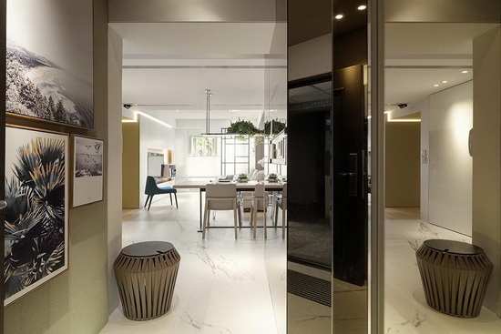 编辑点评:为延伸玄关区的视觉广度,演拓空间设计于壁面铺叙镜面以达放大空间之效,并搭佐艺术画作装饰,营造人文气质感受。