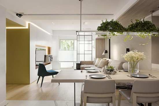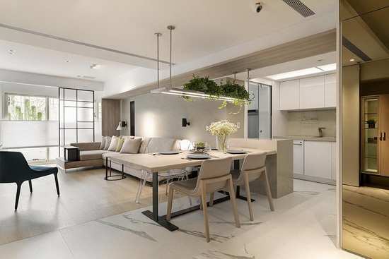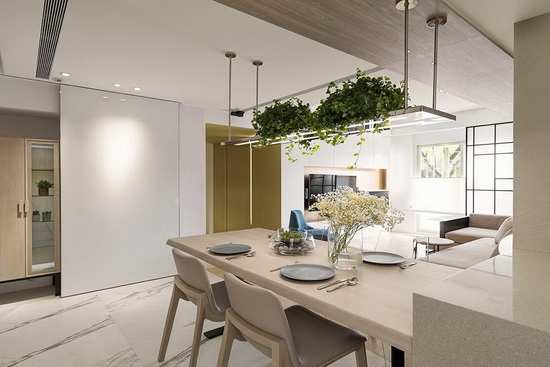 编辑点评:全室以餐厅为场域轴心,和谐串联了玄关、客厅与厨房空间,成为家人谈心、聚首的小天地。