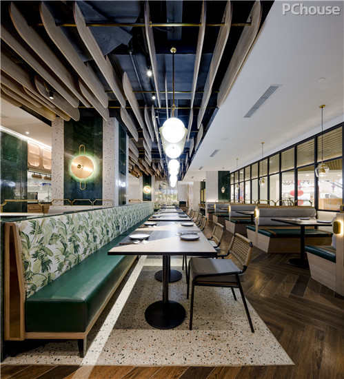 【太平洋家居网 设计频道】普吉天堂餐厅位于上海市第一百货,伴随着第一百货重新开业,项目也同时启动。餐厅灵感来源于普吉岛的日夜光影变幻。通过印度绿大理石、彩色水磨石、带有热带风情的藤编、木地板、镀铜金属和阳光板编织出一个带有普吉韵味的当代都市餐厅。阳光板和纱帘以及藤编的朦胧感给我们带来了惊喜。
