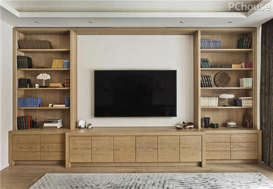 电视背景墙是小户型收纳的重点,将整面墙都打造成电视柜的样式,有效的放大了空间,方便收纳书籍,实现客厅兼书房功能合理变换。