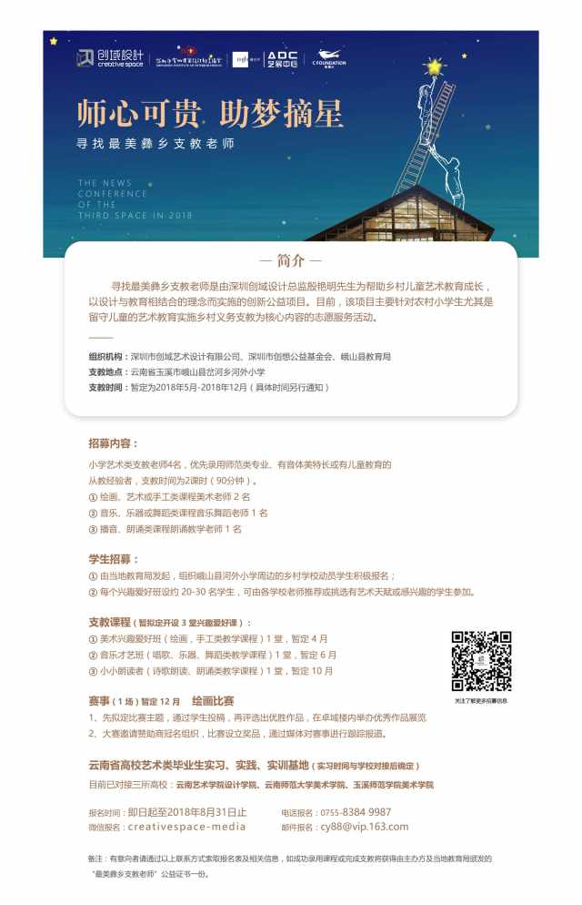 2018年,《第三空间》卓域楼公益项目将从寻找最美彝乡支教老师并开展系列主题支教活动、在《第三空间》卓域楼设立教师实习、实践、实训基地、继续与创基金合作“美学课堂”、与当地教育局合作举办儿童艺术节主题活动及开展以卓域楼为载体的展览、比赛等方面开展。据悉,该公益项目已确定将云南艺术学院设计学院、云南师范大学美术学院和玉溪师范学院美术学院三所高校作为挂牌实习基地院校。目前,“寻找最美彝乡支教老师”已正式在全国范围内展开招募,支教老师将前往云南玉溪河外小学进行短期的艺术课程支教。