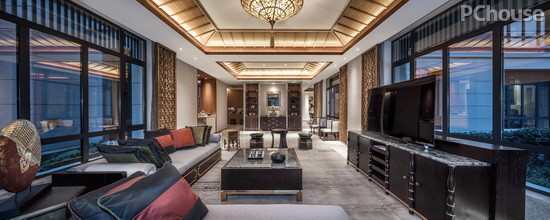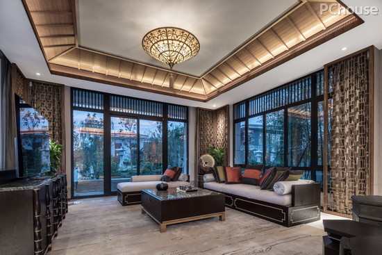 整体空间沉稳大气,于无声中彰显尊贵。设计师通过对东南亚文化元素的选取及提炼,结合当代生活方式的特点融入空间,从天花到灯饰,从立面到隔断,从家具的选择到配饰的色彩,每一处都经过细细斟酌方才妥善设计,营造出一个临水而居、其乐融融的生活空间。