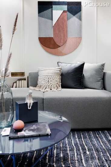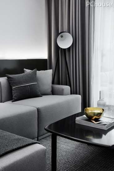 04户型也是三房两厅的结构,面积98㎡。设计师通过布艺、原木、大理石和哑光烤漆,将整体空间控制在黑白灰的主基调——整体60%的浅灰,15%的深灰,15%的纯白,10%的色彩(灰蓝),不掺杂其他偏暖或偏冷的色调,空间的感受全因光的变化而改变——试图以简洁明亮的空间关系阐述房屋,住家与生活。