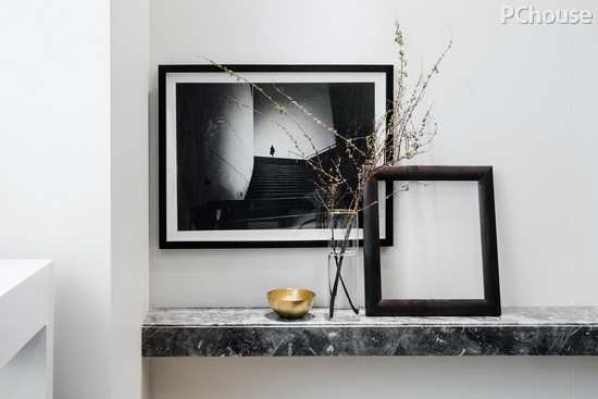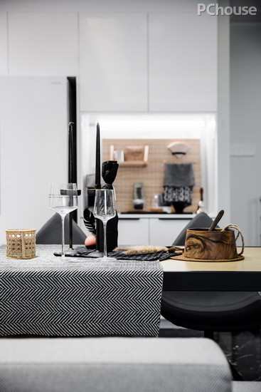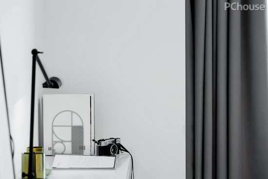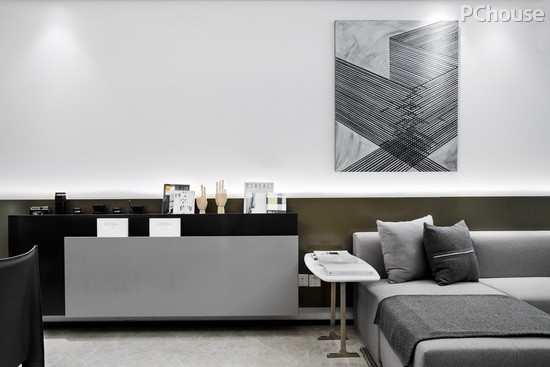 客厅与餐厅空间通过长度7米的背板连接空间,色彩比例进行了大体块搭配和切割的同时,整合了展示(摄像机、单反镜头)和储物(书籍等)的功能。使用黑白线条的油画,突出艺术氛围。其他空间比例分割也如是,形成干净利落又相互关联的空间感。