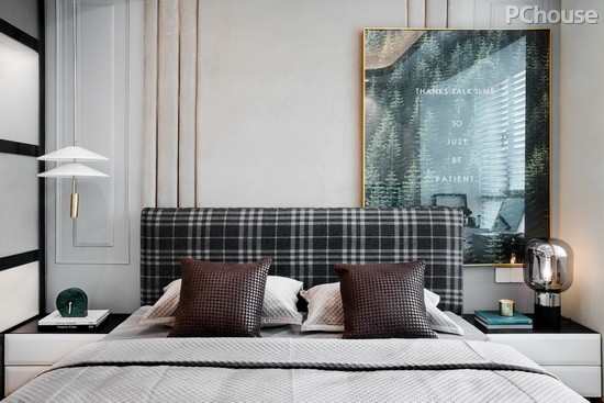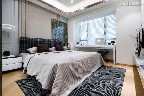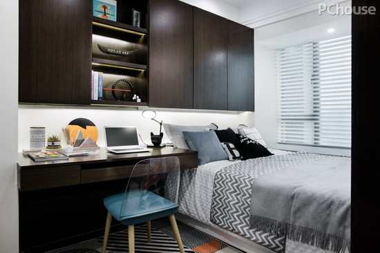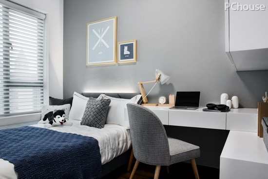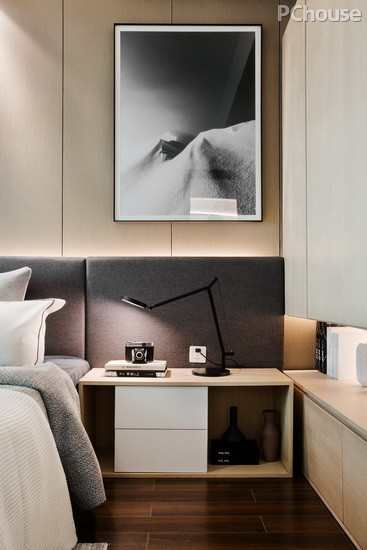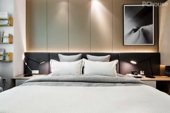主卧室作为休息的空间,整体没用运用大面积的灰,而是原木色,浅色比例较多,让整个空间温暖舒适。设计师在此还设计了一个小小的阅读区域,用以丰富空间的使用功能。次卧定位为主人的长辈到来时的使用空间,整体色调偏沉稳,但不至过于老气,在需要时也适合当作一般客房使用。