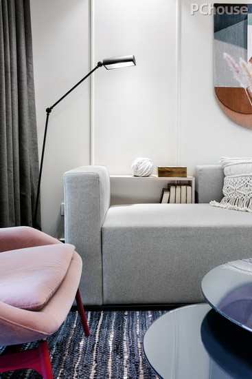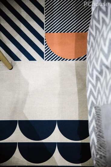 在02户型中,设计师将角色定位为一对分别从事IT行业和服装设计的新婚夫妇。处在对流行不可完全无视的现实,设计仍然采用了带有北欧风格的基调,强调整体的序列性与空间的跳色,强调材质对比。玄关采用建筑图形的直线结构和亚克力材质的摆画提示男主人的个性和相关职业;过道处理成带有一点工作间的意味,设计了一面服装裁剪与服装手绘工具的悬挂板,以形成服装设计师定位的代入感。主卧整体则以轻松色调豆沙色为主,床品以及空间休息区营造慵懒氛围。在考虑儿童房的形态上,以多形态几何体色块取代传统儿童具象的卡通情节营造童趣氛围,不跳离整体空间的形态。