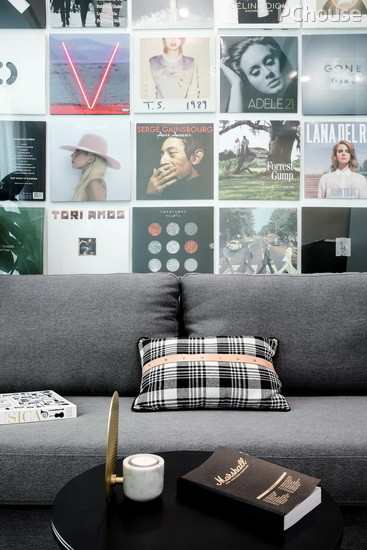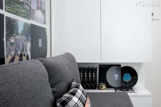 在该户型设计过程中,多功能房是主人爱好的一个特写。20张当年原版的黑胶唱片阵列排成的背景墙搭配深灰色的沙发床既可以提供平时闲坐也可以临时充当客房。整个空间通过木吉他,黑胶这类细节,呈现一个主人爱乐的主题。