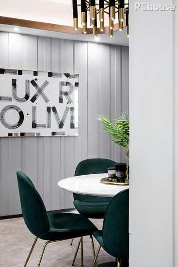 在客厅的处理上,设计师在墙面采用约20度的灰与约80度重灰色丝绒窗帘形成整个空间的主色彩基调,而配以浓重的绿色大株植物为点缀,用米白的真皮沙发,复古的真皮拉扣单椅,marshall蓝牙音箱,绅士的金色的方耳熊,搭配超大号的狐狸毛抱枕,丰富空间的色彩层次和体块变化。作为这一配搭色彩在主要空间的延伸,设计师同样在餐厅采用雪松绿的餐椅搭配大理石台面的餐桌和金色的装饰柜,强调屋主的生活品味。