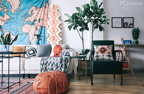 家中柔软的纺织品也是改变白墙的一大亮点。不论是大幅的挂布、手工编织的挂毯,都可以挑些与空间相匹配的,精心搭配呼应,利用织物的颜色、材质或形状的变化,化解白墙的单调感。