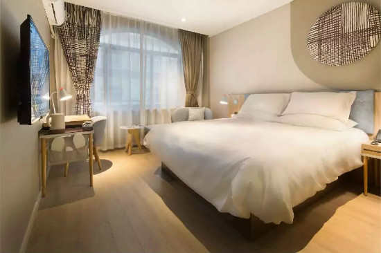 简约又丰富,搭配独特的装饰元素是NEO的客房。酒店配有32套客房,其中27套面积为20平米的标间,以及5套面积为32平米的豪华套房。所有客房都被重新改造成统一的设计风格,采纳了与酒店其他空间相似概念的设计元素。窗帘的布艺设计增强了客房的装饰感,麻织布料上图案是典型的NEO空间装饰图案。窗帘使用不同布料的组合,带有标志性装饰的窗帘图案,与背景墙上的主题装饰图案形成平衡感。主题装饰图案上三种不同颜色的搭配,也是品牌三种线条的体现。和灯具的色彩设计语言一样,家具的设计也同样使用了梅红色的局部点缀;和其他的家具一样使用了木质的材料,体现质感。代表品牌的材料和色彩在NEO品牌中的各个细节中都得到了体现。最后但也具有亮点的是客房卫生间设计,非典型的设计让三件套不再典型。洗手盆使用木质的箱体,重要景观墙面使用NEO Blue 的瓷砖,都让Homeinn系列NEO品牌体现了“如家”般的温暖。