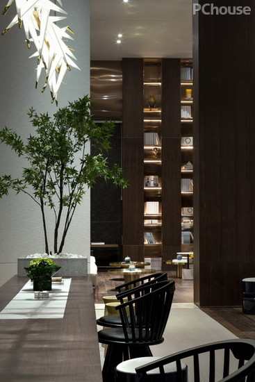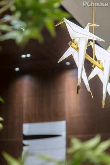 洽谈区一角特辟有一个水吧区,清鲜的绿植是此处的主角,自然生长的枝叶绿意盈盈,让整个空间的氛围舒适放松,充满诗意的折纸鸟形灯,栖息在黄铜“树枝”上,微风袭来,小鸟会自然左右摇摆,空间由静入动,更显生机盎然。设计以现代手法呈现东方的审美意趣,一个原木长桌与混凝土制花盆巧妙地融为一体,恰如石与木的怀抱相连,自然的妙笔在空间中悄然生发。吧台背后的背景墙,硬包以隐约的雕花点缀,赋予空间更多的人文意趣。
