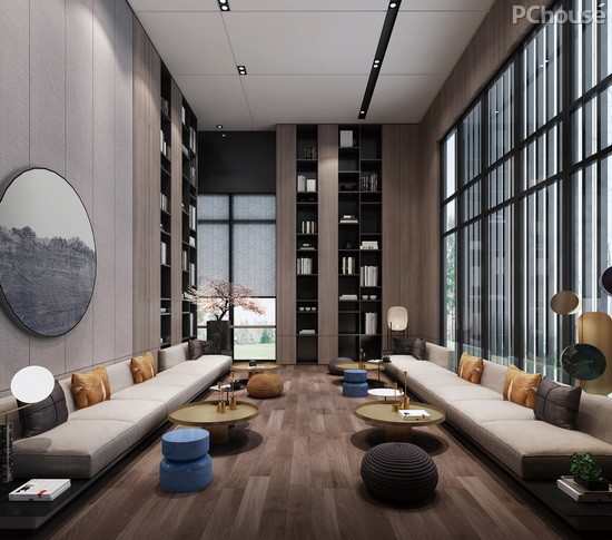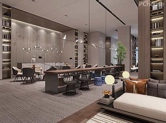 书吧设计浸润着木的温情,配色干净凝练,还原着空间的质朴,两排长形沙发简单舒适,散发着坦率与真诚。长方形的空间布局,一侧墙壁为白色棉麻的硬包,另一侧则是整面墙的落地窗,拉起轻纱帘幔,便可迎接晨昏日暮的自然变迁。