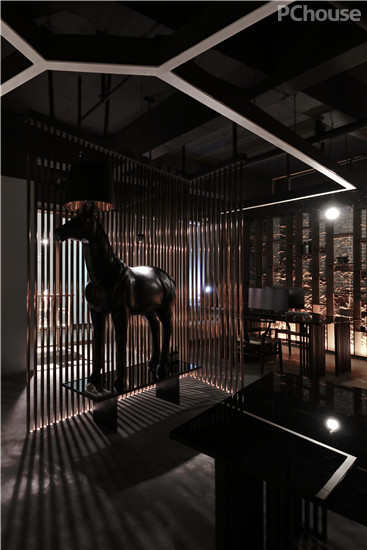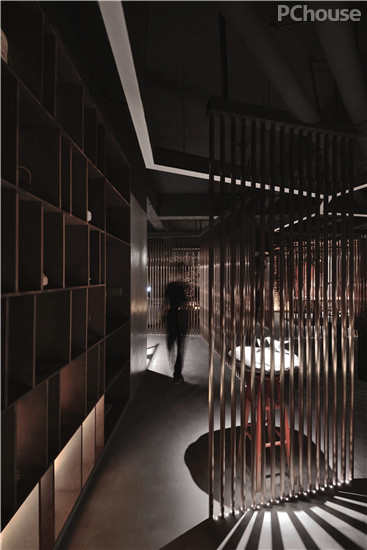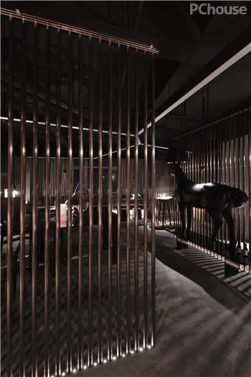 竹在中国传统文化中的有着非常重要的象征意义——正直、奋进、虚怀、卓尔。设计师运用镀铜铁柱组成的线性列阵营造出独具特色的竹林意境。铜柱把整个空间分隔出不同的功能区域,又让彼此在铜柱的均匀间隔中相互渗透,使之在虚实间相互包含,相互贯通。铜柱列阵在设计师别出心裁的安排下互相保持着特殊的角度,让空间恍如十里画廊,景随人至,步移景迁,给予观者别致的空间体验。在空间各处流露着现代设计手法和传统意境的相呼应,和寄托在设计师心中的山水情怀。