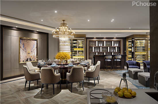 漫步至宴客厅,采用了视野开阔的开放式格局,时尚大气的高级定制家具和宽敞的空间演绎世家风度。通过精简灵动的曲线,在创意吊灯、地毯等不同的“形”与“色”融为一体,突显艺术品位,瞬间有一种浮华过境般浸染了整个空间的画面,似时光留驻,又有几许悠然。