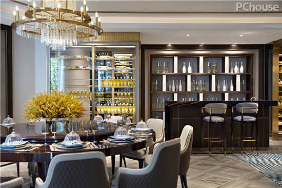 另一侧的餐厅以设计的语言将艺术和创意洒落在生活的细节处,创造性地将地面采用水晶木纹石几何拼接,同时对餐厅的格调作了延续,如金属框架的玻璃红酒架,深色简约餐桌和米灰皮餐椅的搭配,让人们深入空间不自觉地感受到一股暖流和时尚轻奢风在空间碰撞交响。这是家的味道,也是幸福的味道。