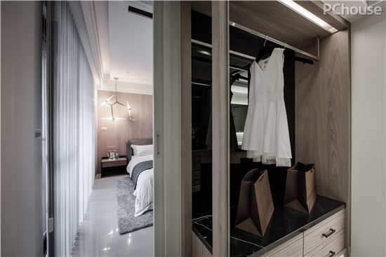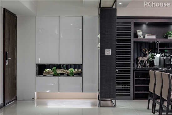 简约现代的利落中透露着细致陈设,开放性无间隔场域从客厅延伸到餐厅。双厅皆规划大面积的壁柜,整齐清晰的隔层让收纳摆设一目了然。餐厅柜体多了酒柜储藏功能,酒瓶与水晶杯在视觉一致的收纳下呈现另一番品味生活的样貌。