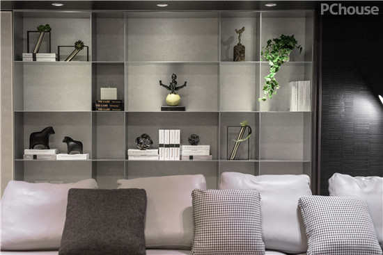 自客厅延伸至餐厅的开放场域,在宽广的空间中规划复数大面积壁柜,整齐清晰的收纳格让人一目了然,置入充满时尚感的摆设饰品,增添空间意趣。柜体除了艺术性的美感之外,也兼具了酒柜的储藏功能,在视觉一致的收纳下,共同呈现出另一番值得品味的艺文生活。