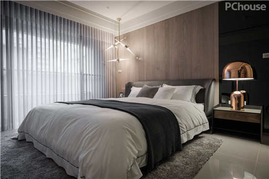 主卧室以抛光石材为地面打造基础,偏白的淡雅色调使空间内呈现安稳、怡人的气氛;环绕室内的壁面以全然不同的材质构成,床背墙透过木纹温润的本质塑造舒适氛围;侧墙由直立柔纱帘覆盖,线条利落刚直不失柔韧;与主墙面相对之处以高级壁纸铺装,在强烈的对比之间,正是房间主人沉静的时刻。