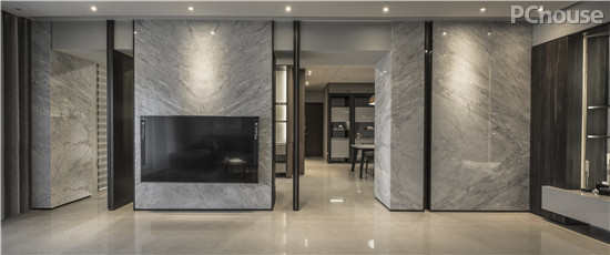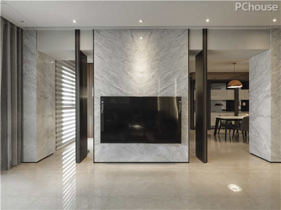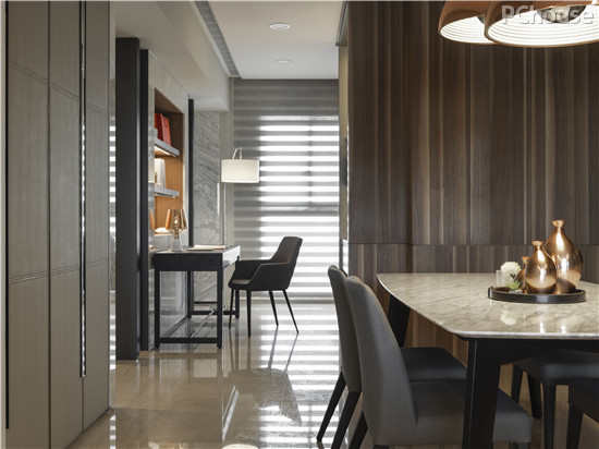 利用电视墙后方砌出开放式的书房,良好的采光在白天也能尽情享受阅读乐趣,而通透相连的设计打破公私领域的藩篱,串连散失的美好,写上珍惜每一刻相处时光的语汇;书房与餐厅以温润的胡桃实木拼缓和大面积石材带来的冰冷感,由外到里虚划出一条客餐厅的界线,叠加多元的空间层次。