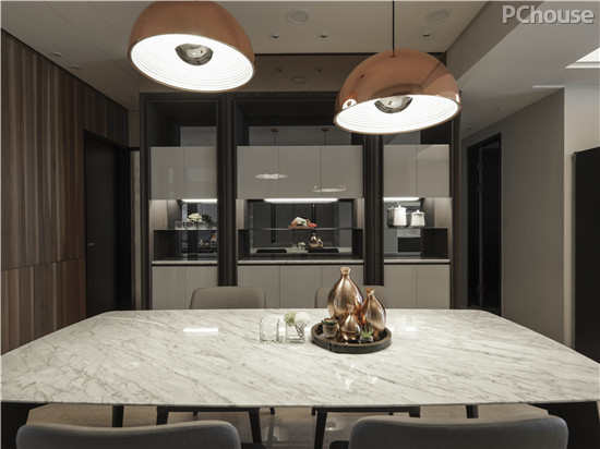 与玄关仅有一壁之隔的餐厅,通透动线设计缩短客餐厅距离,汇聚下班时迫不急待享受温馨美食的愿望;现代时尚质感的红铜吊灯与餐桌上的同色系摆饰呼应,为用餐空间填上主题性,形塑浪漫温暖气息,餐厅内的摆放柜贴上反射镜拉长空间,留下一家人团聚于桌边的喜悦模样。