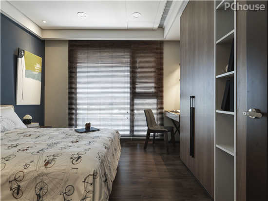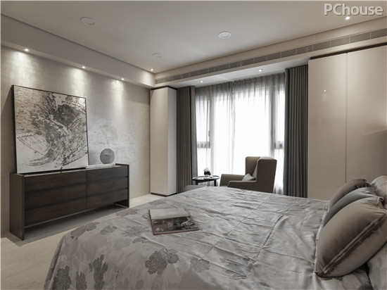 主卧室运用各种不同材质的白色营造高雅调性,正对床铺的现代风格画作,为简单的房间添上一抹时尚风格;利落的家俱柜体,隐藏于落地窗两侧,简明朴实外表下的设计有着不同于一般的创意;L型的柜门给予更多的机能收纳空间,简约的设计风格却包含设计师的巧思。