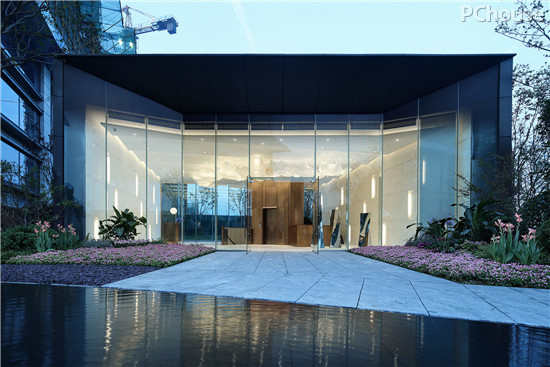 石材的肌理如锤纹银器,将倒影破碎成美妙光斑,太湖石造型的铂晶雕塑,如同舞者身姿曼妙,张力十足。