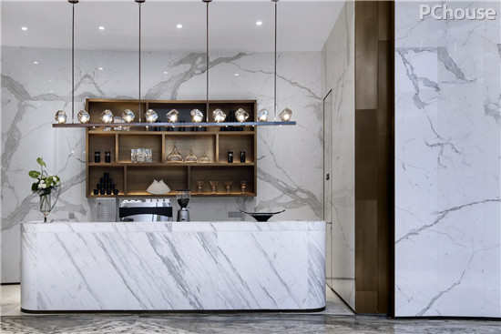 如果前面还是序曲微妙引导,来到大厅视野陡然扩大,则是洪波涌起,可谓“惊涛波澜来似雪,半入江风半入云”。大面积的留白设计让空间澄澈,展现出曲线美。