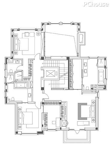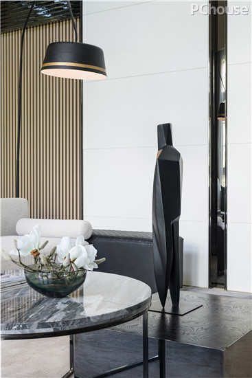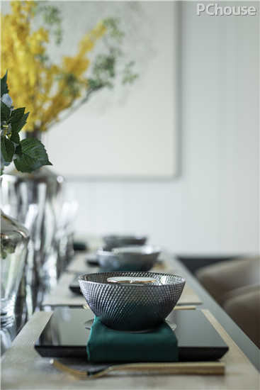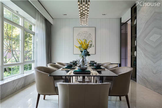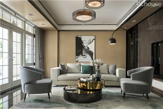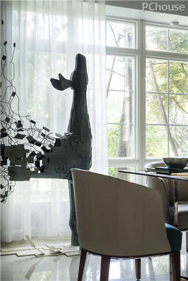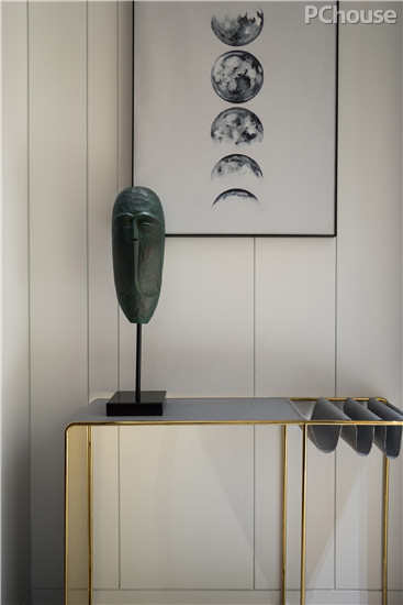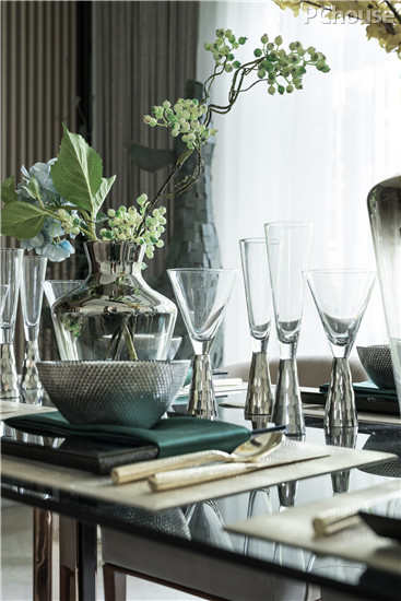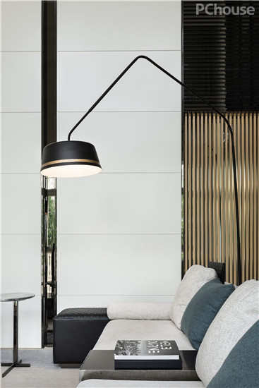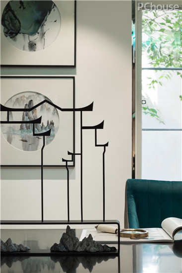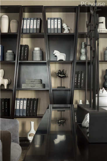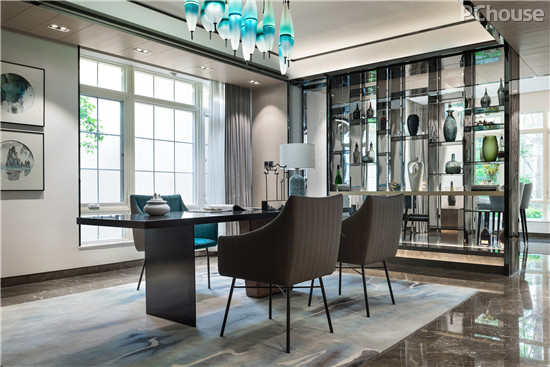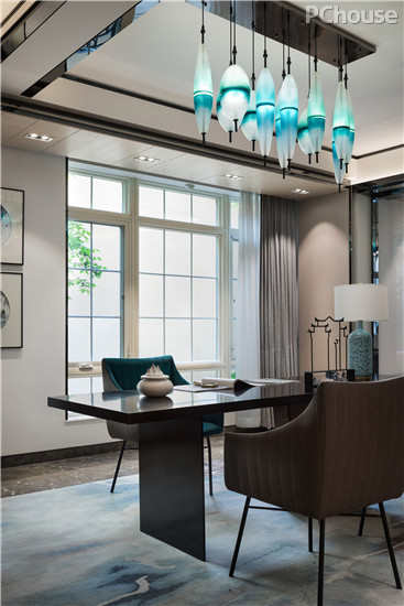 开放式书房设计,把书房的功能性与现代人的精神需求相融合,加入些许传统中式元素,与现代艺术糅合升华,在淡雅中体现空灵。陶瓷、玻璃器物、山水意境挂画摆饰、取意灵动水光的灯饰与地毯、湖蓝搭配深棕的单椅,为精英阶层生活营造一个安静闲适的精神境域。