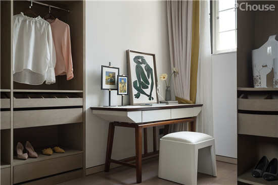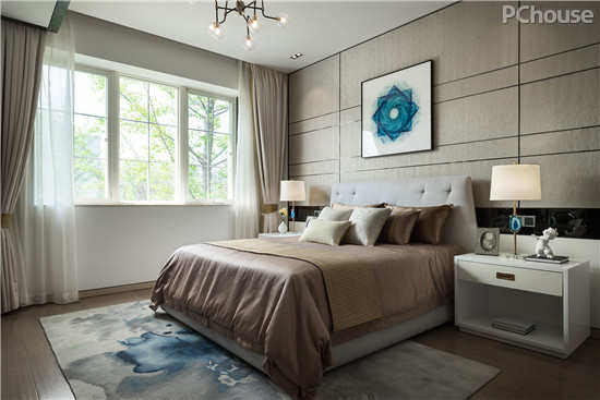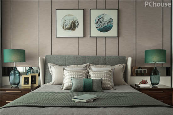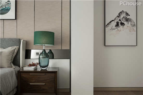 次卧设计以温柔的灰色为主调,翠绿色透明灯饰的置入,让空间更显得清透明净,内敛中透着优雅气质。木制地板、柜体的硬实与泼墨纹地毯、棉麻舒适床品的柔软相搭,融合简约的现代风与雅澹的中式元素,让空间的质感构成平衡。
