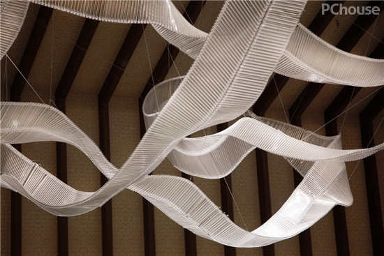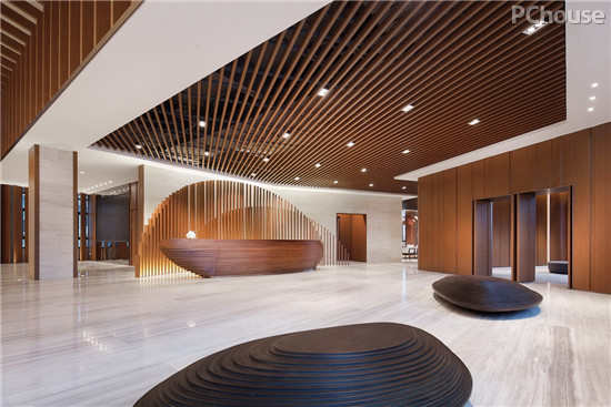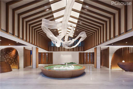 在表现空间的过程中,“况阳春召我以烟景,大块假我以文章”成为设计方在表现形式上的指导思想。在平面布局注重空间的开合关系,在空间效果上则注重建立一个大与小,疏与密,繁与简相对应,有节奏感的空间秩序。因此设计师在建立室内空间秩序的同时,利用一条可塑材质创作的装置在大堂中央部分形成舞动的状态,打破空间因对称的平衡和材质的秩序感可能造成的呆滞感,由视觉的层面产生灵动的感受。它是整部乐曲中需要流露的灵魂。
