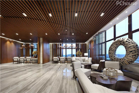 建筑线条利落,空间好用,其所展现的形态外观(尤其门头)与自然环境相对,隐然有睥睨雄踞之意。因此,在室内部分的设计过程中,设计师更多考虑在心理层面与自然的相融和相互延伸。